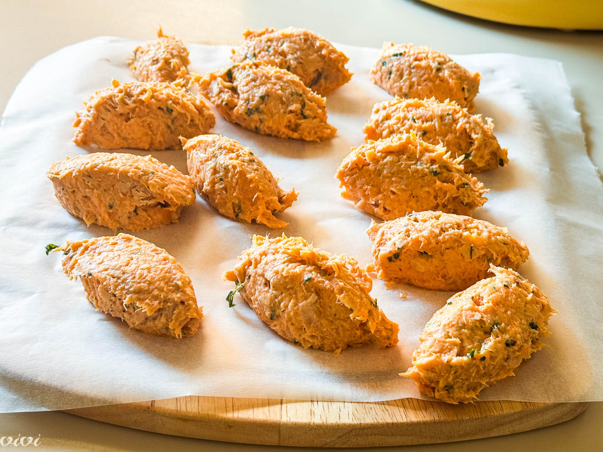 Iz ohlajene tunove mase z dvema žlicama oblikujemo enako velike žličnike, jih oblikujemo z rokami v krokete in naložimo na majhen pekač obložen s peki papirjem. Za 10 minut jih postavimo v zamrzovalnik.