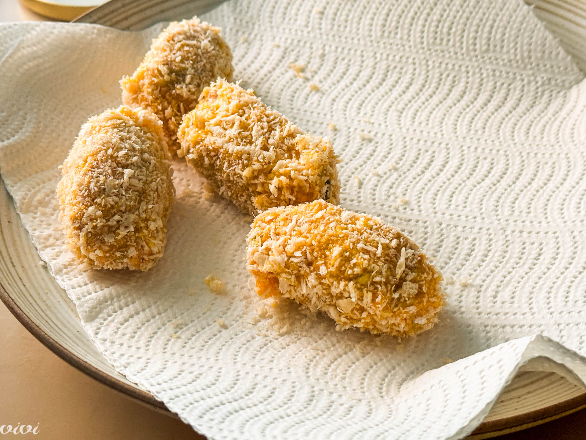 V loncu segrejemo olje za cvrenje na 170 stopinj. Krokete povaljamo v moki, razžvrkljanem jajcu in panko drobtinah. Nato jih v dveh porcijah zlato rjavo ocvremo in odcedimo na kuhinjskem papirju. Serviramo vroče z limonovo majonezo.