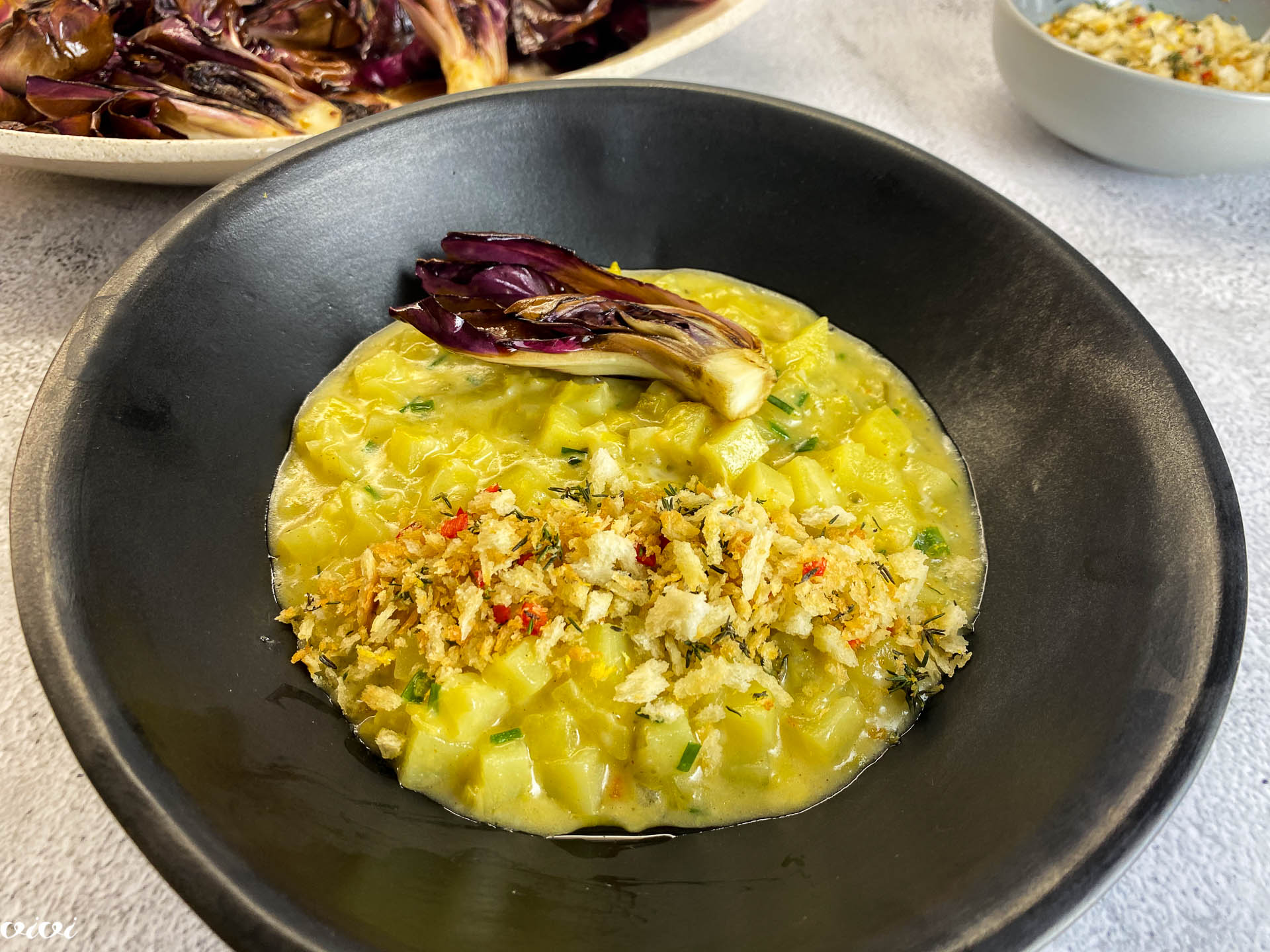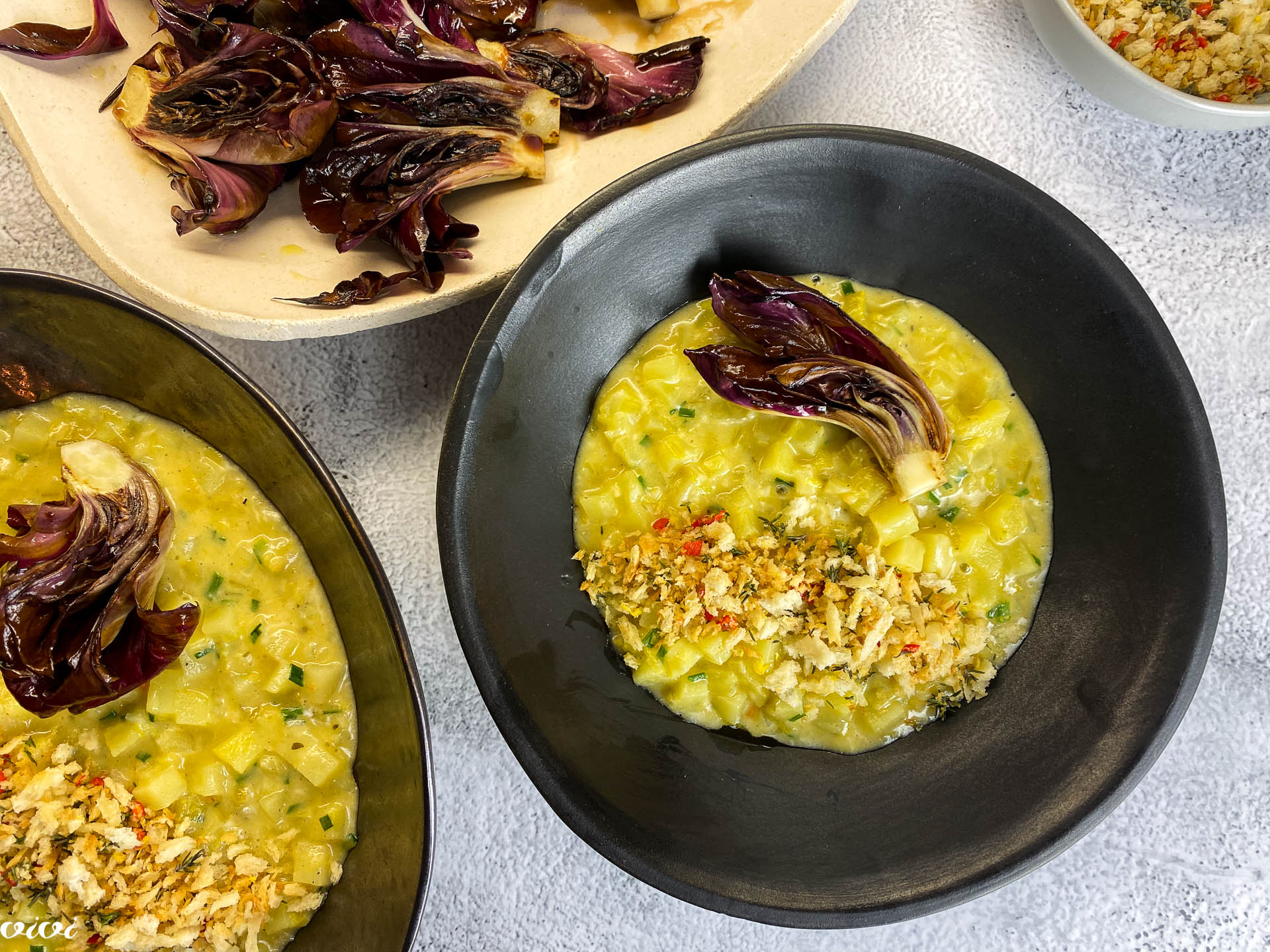 V krompirjevo rižoto zamešamo parmezan, naribani sir in drobnjak. Naložimo jo v ogreta krožnika, potresemo s panko drobtinami in okrasimo z goriško rožo. Preostali radič in panko drobtine serviramo posebej.