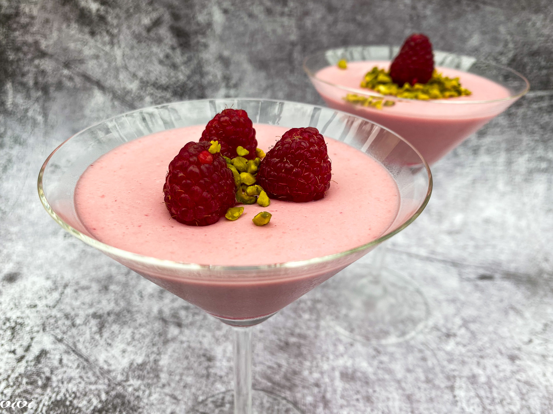 V smetano previdno zamešamo malinov pire, napolnimo kozarce za serviranje in jih postavimo v hladilnik preko noči. Pred serviranjem panna cotto potresemo s pistacijami in okrasimo s svežimi malinami.
