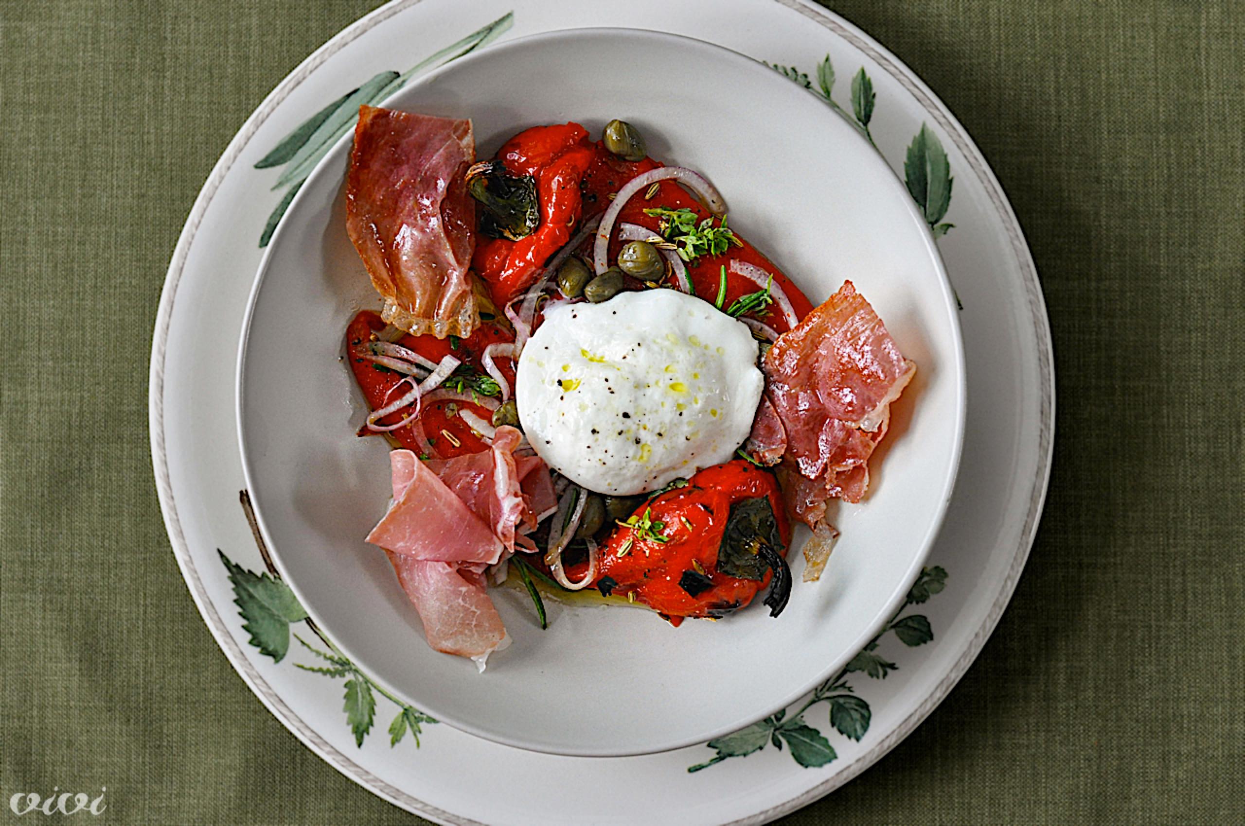 Na krožnike naložimo marinirano papriko skupaj z marinado, mlačno mocarelo in rezine pršuta.