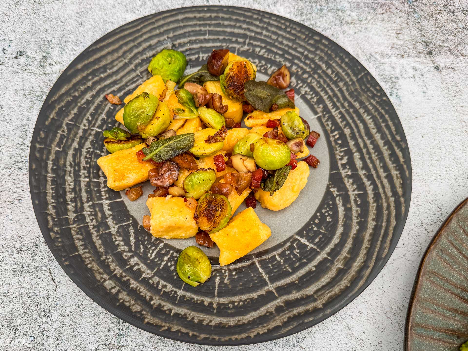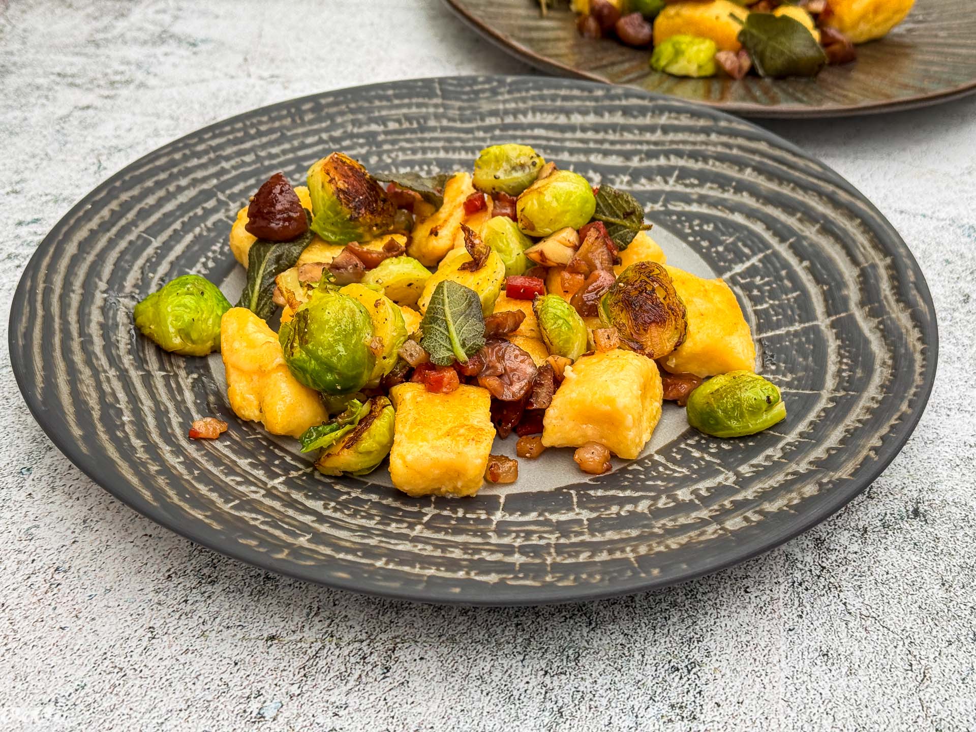 Njoki z brstičnim ohrovtom, guanciale in kostanji