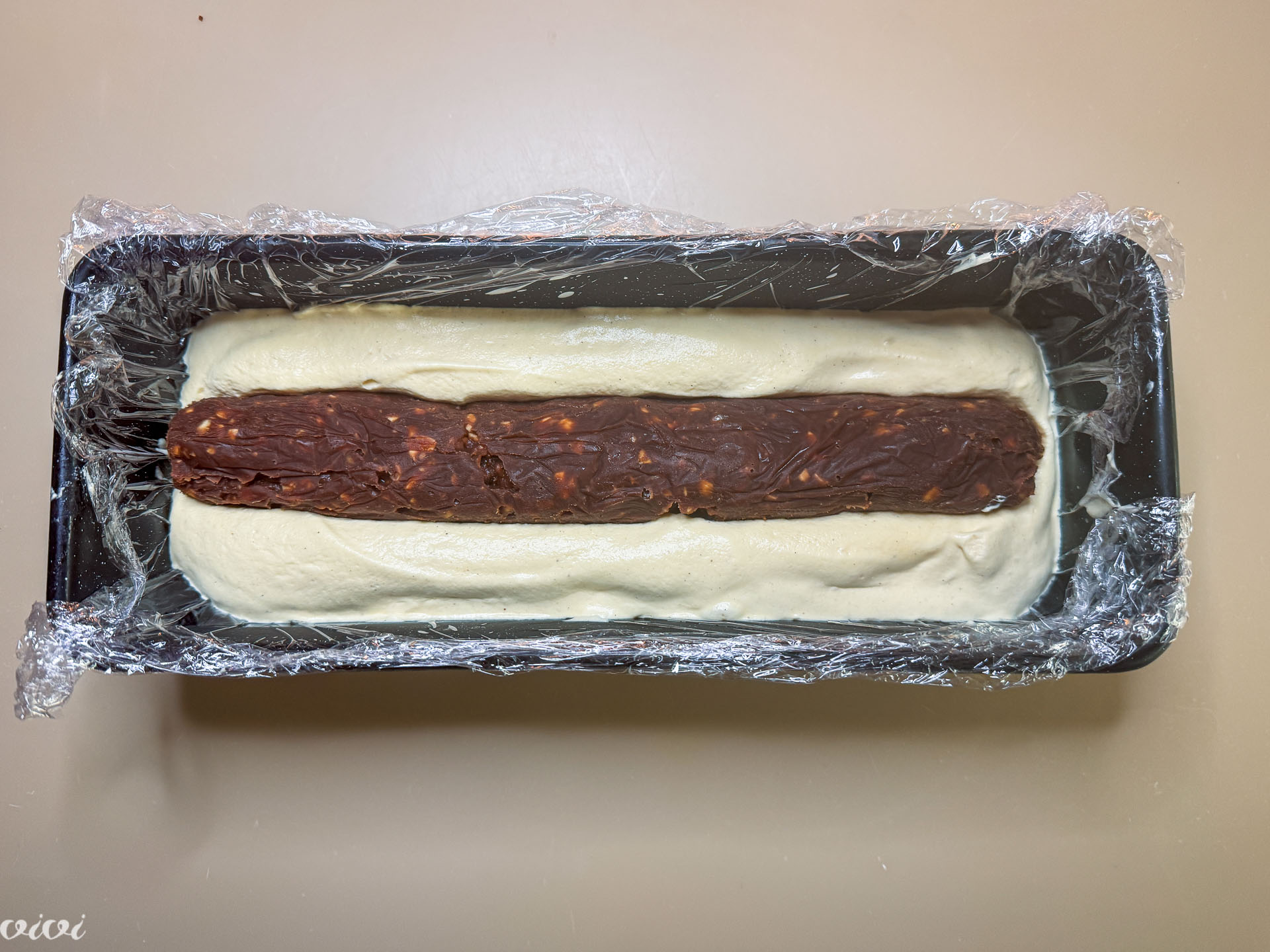 Nato nugatovo maso položimo v obliki valja na list prozorne folije. S pomočjo folije oblikujemo 22 cm dolgi valj valj s premerom 3 cm. Zavijemo ga v folijo in postavimo v zamrzovalnik za 45 minut.