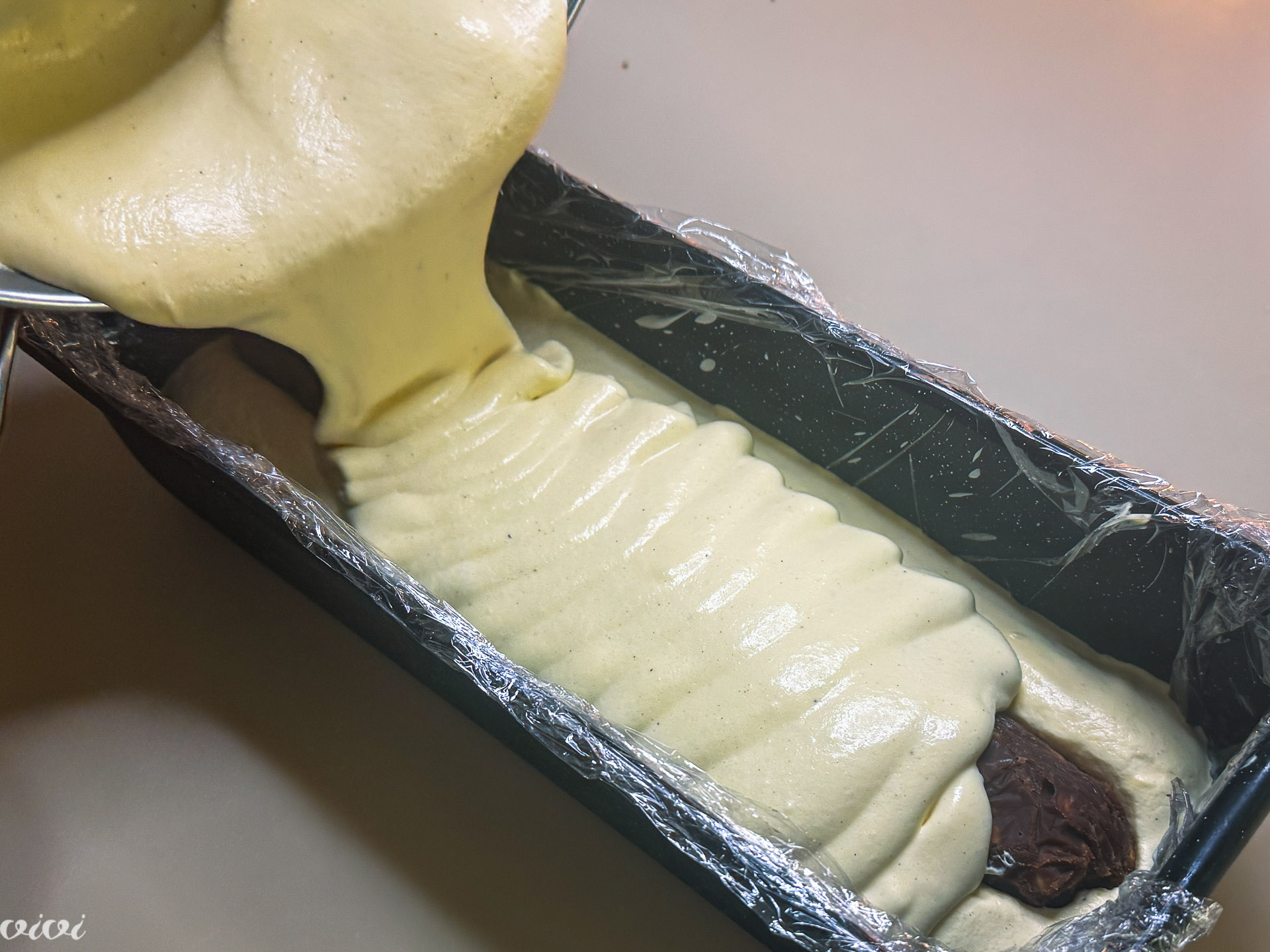 V model porazdelimo polovico jajčne kreme, nanjo položimo nugatov valj, ga rahlo potisnemo v kremo in prekrijemo s preostalo kremo. Parfait pokrijemo s prozorno folijo in postavimo v zamrzovalnik preko noči.