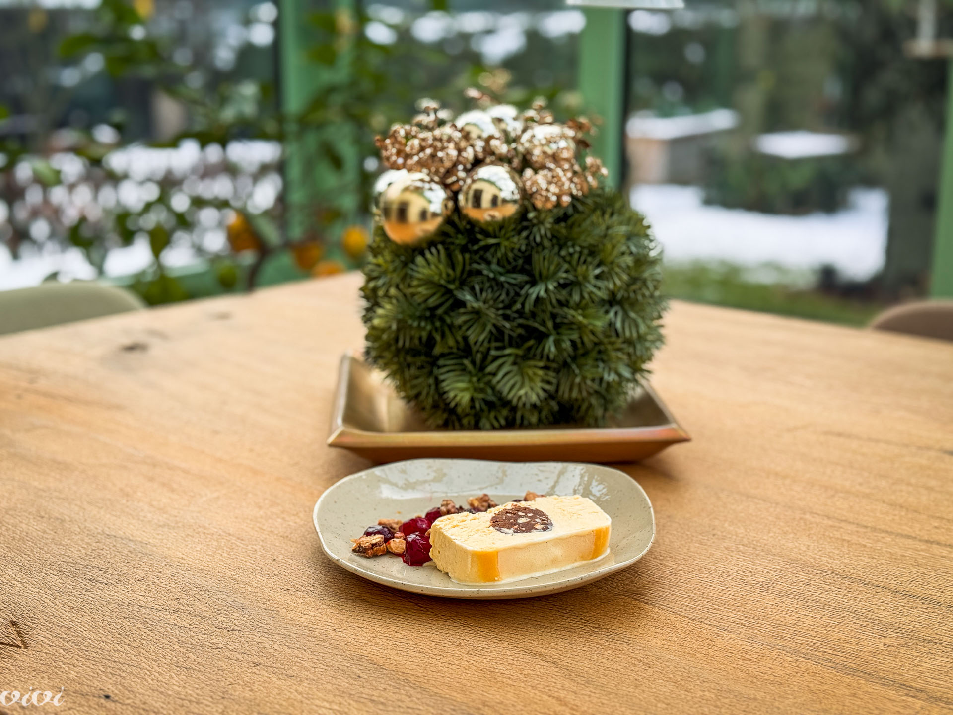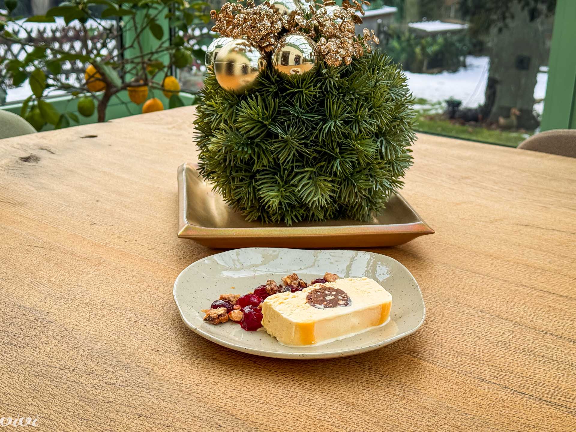 Pred serviranjem parfait zvrnemo iz modela na desko in ga narežemo na 2 cm široke rezine. Naložimo jih na desertne krožnike, potresemo z orehovim krokantom in dodamo žlico brusničnega kompota. Preostali kompot serviramo posebej.