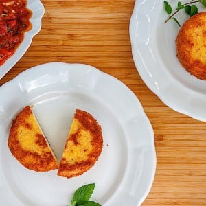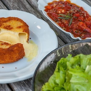 V manjšem loncu segrejemo olje do 170 stopinj (dovolj je vroče, če damo ročaj lesene kuhalnice v olje in nastanejo mehurčki). Vanj položimo panirane camemberte ter jih zlato rumeno ocvremo. Odcedimo jih na kuhinjskem papirju in takoj ponudimo s paradižnikovo marmelado.
