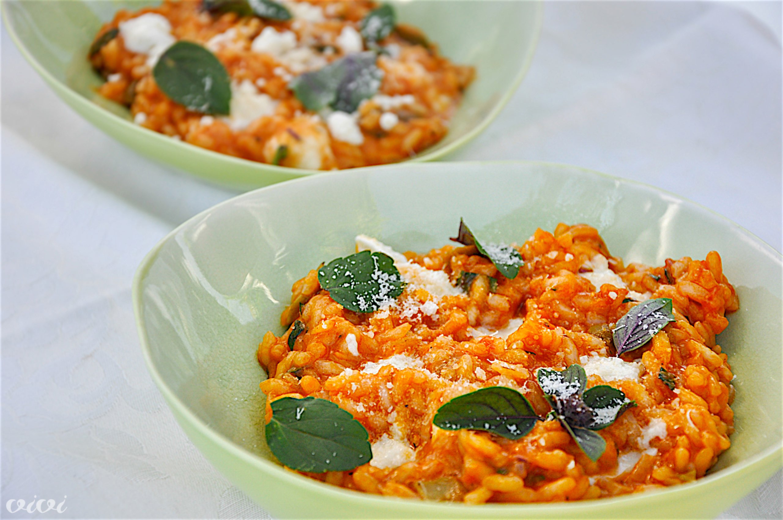 Mocarelo natrgamo na majhne kose. Baziliko osmukamo in lističe drobno narežemo. V rižoto zamešamo maslo, 1 žlico parmezana, baziliko in mocarelo ter pustimo stati 1 minuto. Pred serviranjem potresemo s preostalim parmezanom in okrasimo z lističi bazilike.