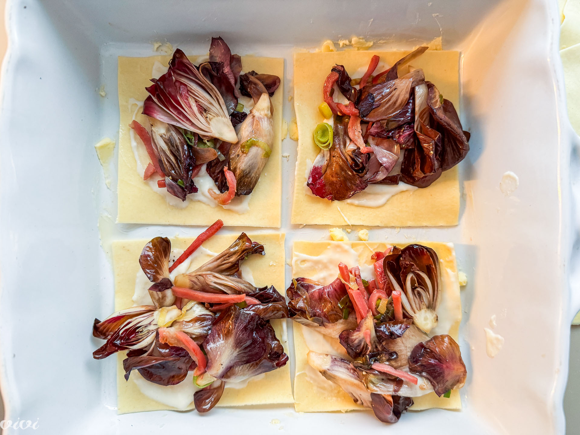 Lazanje smo uporabili v pastiču, ki pa smo mu namenili le tri plasti testenine, da je dragoceni radičev nadev med njimi imel dovolj prostora in pozornosti! In še nekaj listov sveže ”vrtnice” za povrh. Presodite sami, ali ni/je to najboljši recept za najboljši radič!