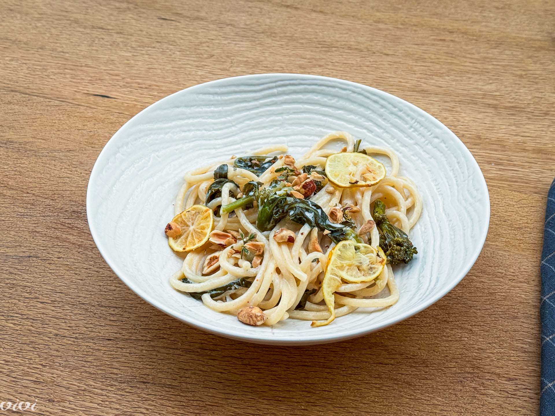 Majhno ponev rahlo segrejemo in limonove rezine opečemo na obeh straneh. V omako zamešamo odcejene testenine ter začinimo s soljo, poprom in francoskim čilijem. V ogrete krožnike naložimo testenine ter jih potresemo s pečenimi limonovimi rezinami in lešniki.