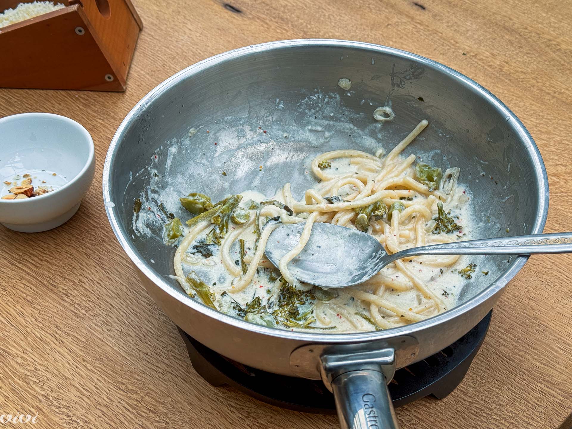 Dolijemo vino in skoraj v celoti pokuhamo. Nato dodamo 100 ml vode od kuhanja testenin in kozji sir ter vse skupaj kuhamo nekaj minut.