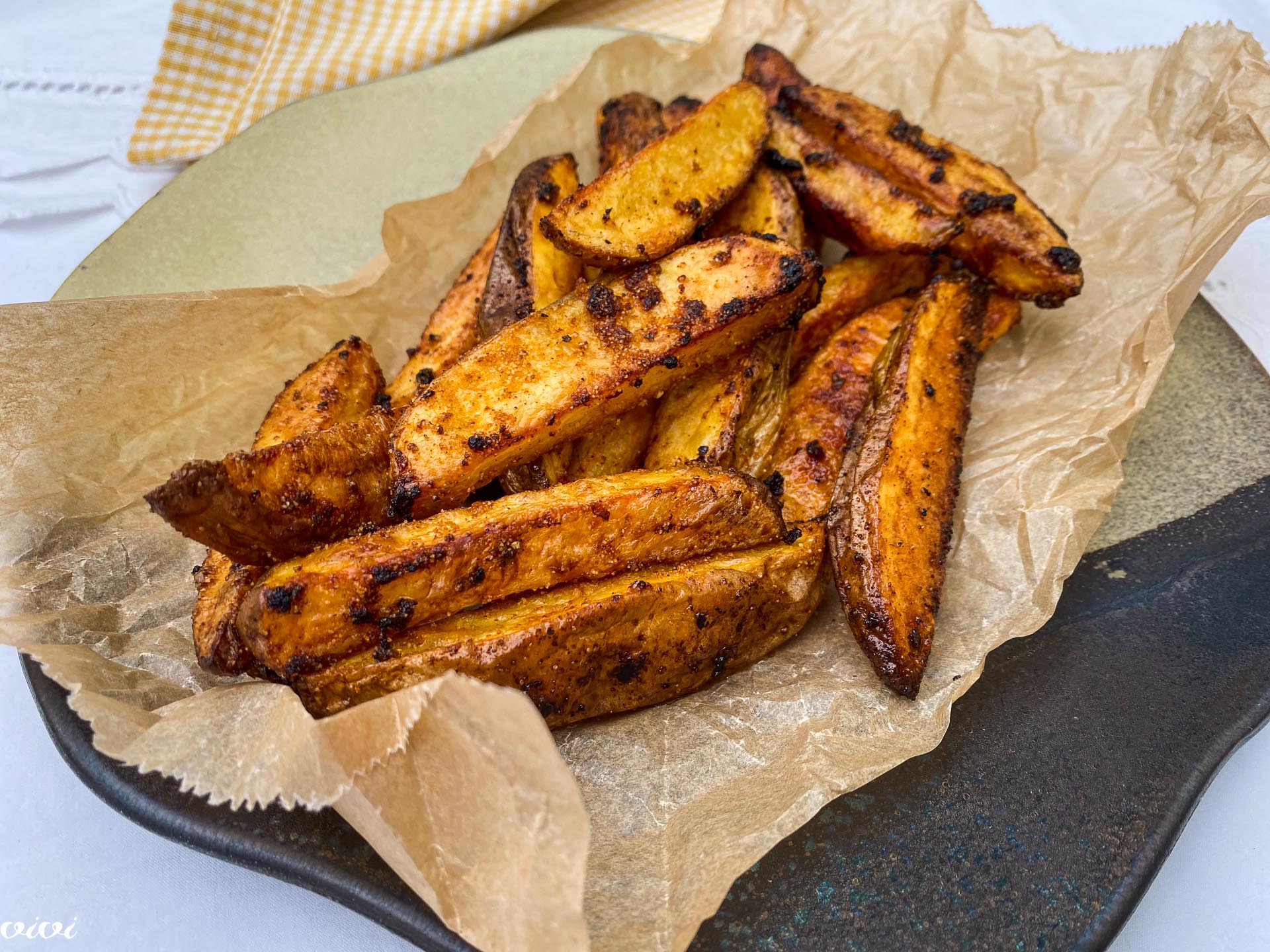 Pečico segrejemo na 240 stopinj. Krompir olupimo in po dolgem narežemo na 1,5 cm široke palčke. V velikem loncu zavremo soljeno vodo, vanjo stresemo narezani krompir in kuhamo 5 minut. Krompir stresemo na cedilo in dobro odcedimo.