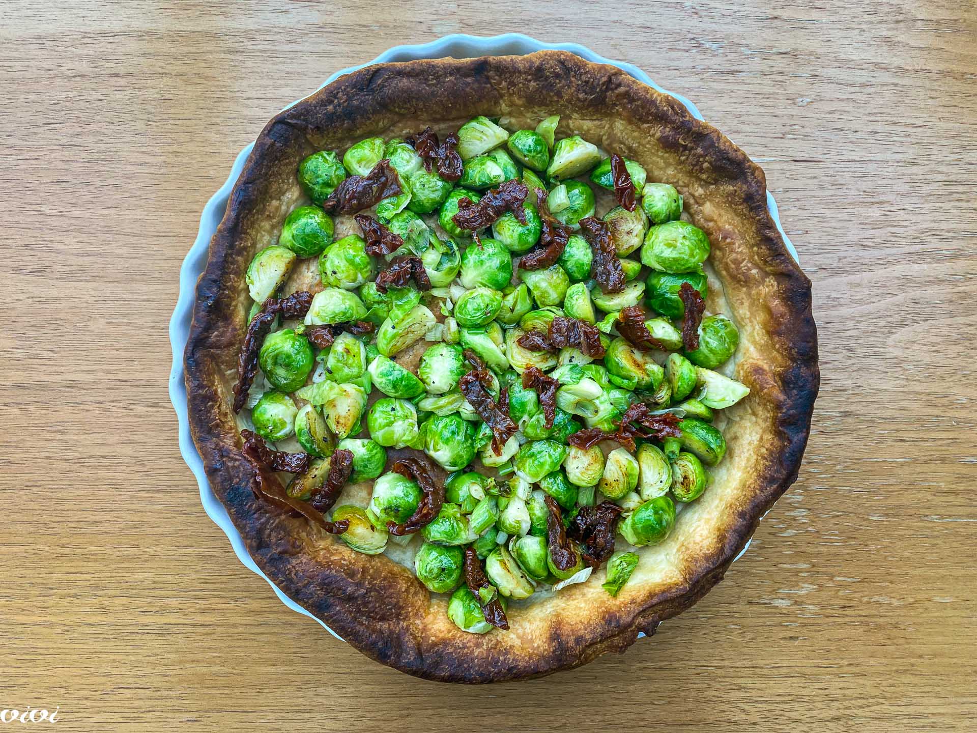 Po pečenem testu potresemo praženi brstični ohrovt in suhe paradižnike ter prelijemo z jajčno kremo. Quiche pečemo na spodnji rešetki 25 minut, nato ga prestavimo v sredino pečice in pečemo še 5 do 7 minut. Pečeni quiche vzamemo iz pečice in pustimo stati 5 minut. Šele nato ga razrežemo in zraven ponudimo radič v solati.
