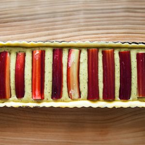Medtem rožmarinove iglice drobno sesekljamo. Rabarbaro očistimo in narežemo na 9 cm dolge kose. Podolgovati model za tarte 11 x 25 cm (ali okrogel s premerom 24 cm) dobro namastimo.