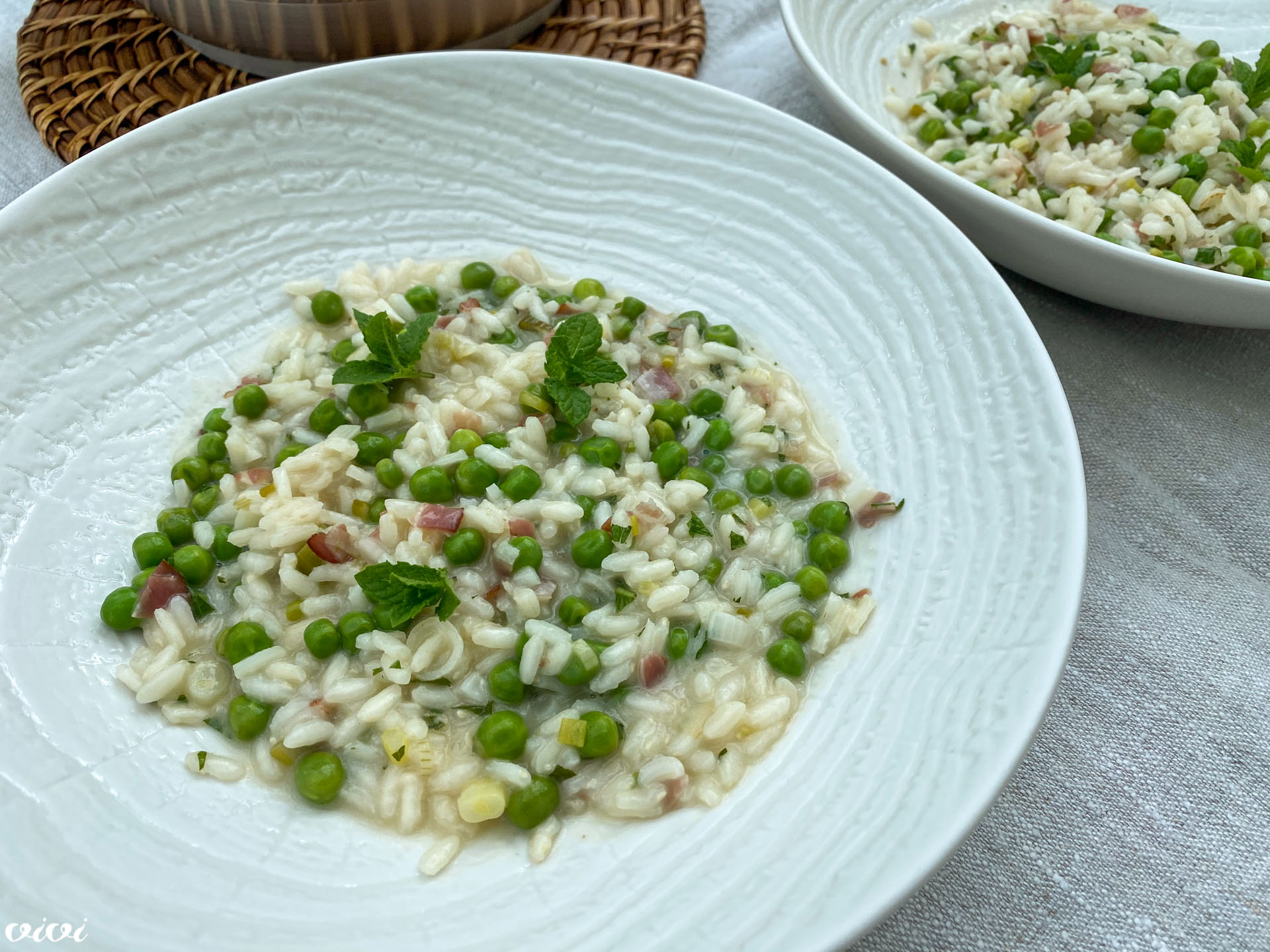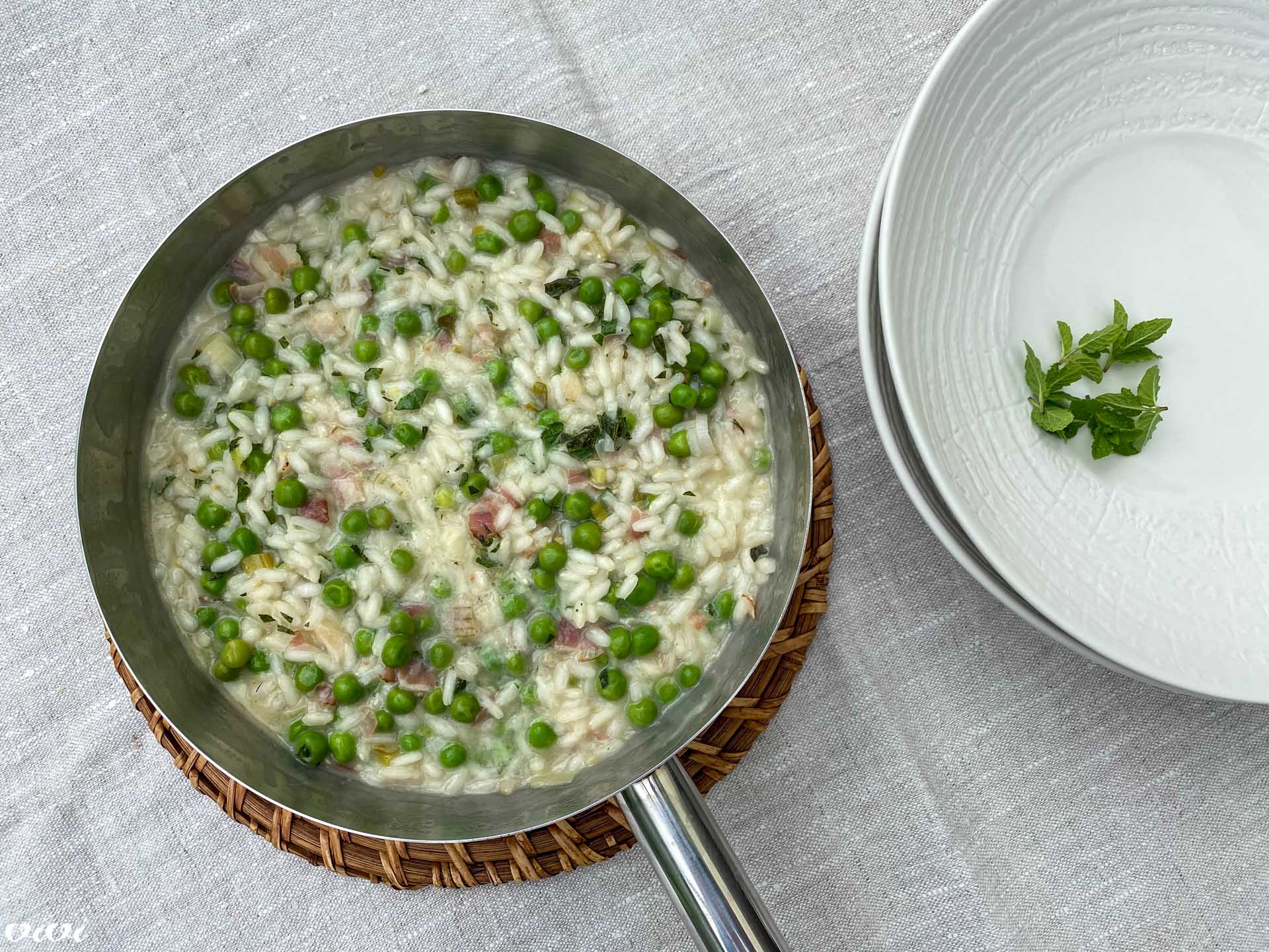 Nato v riž zamešamo grah in kuhamo še 15 minut med dolivanjem juhe in mešanjem. Na koncu v rižoto zamešamo parmezan, preostalo maslo in po želji sesekljana zelišča, začinimo s sveže mletim poprom in pokrijemo. Rižoto pustimo stati nekaj minut, nato jo serviramo s sveže naribanim parmezanom.