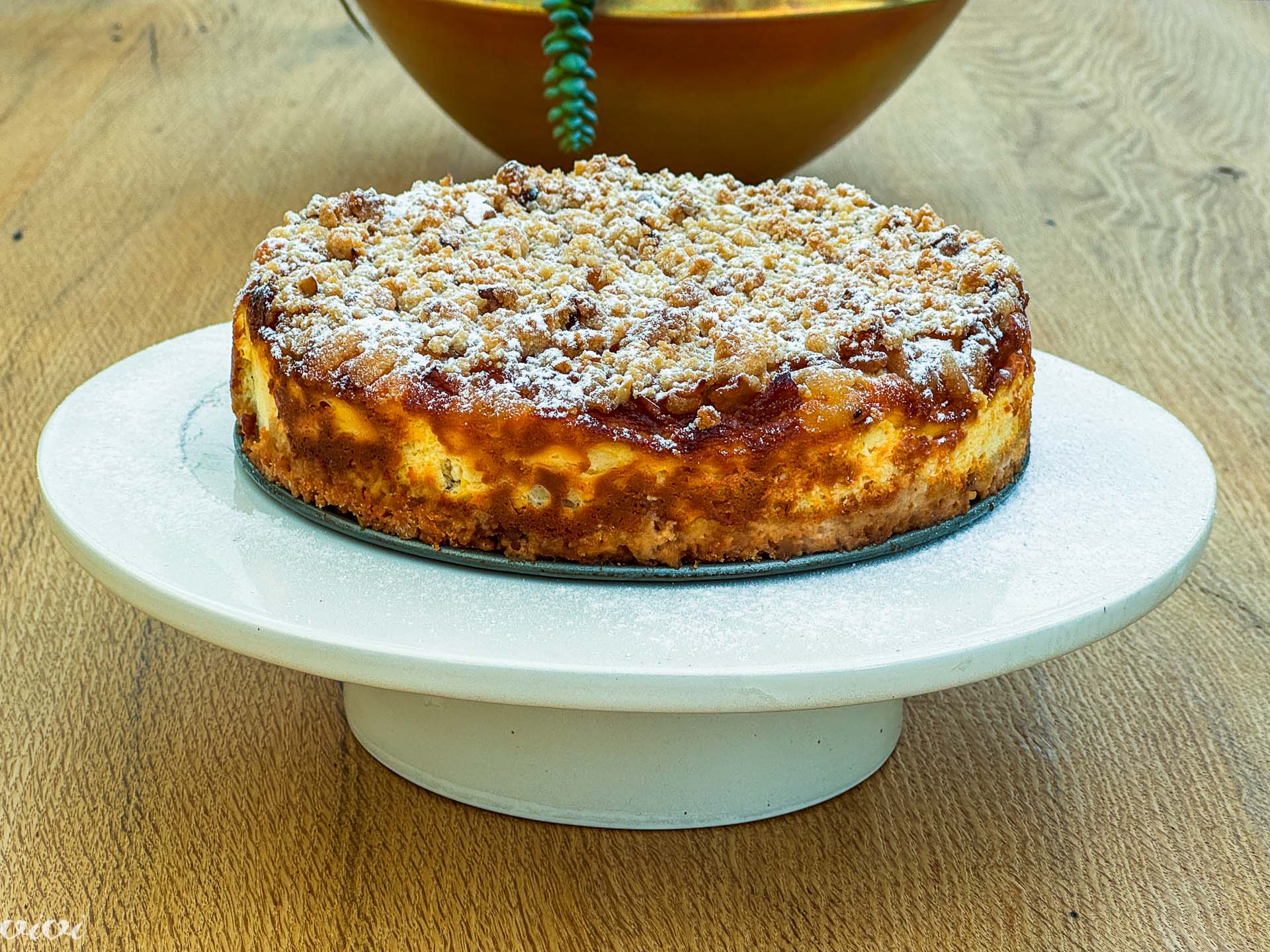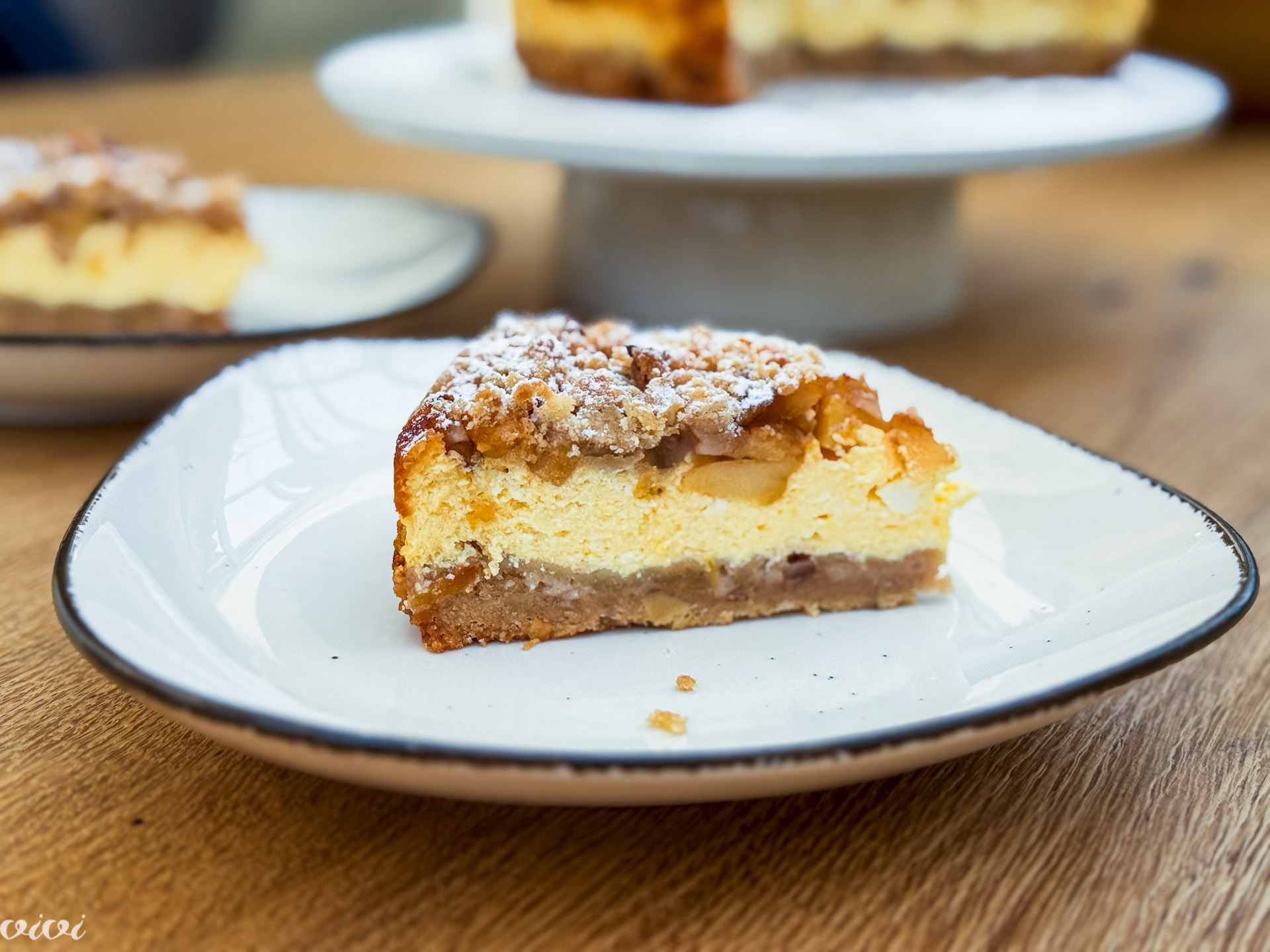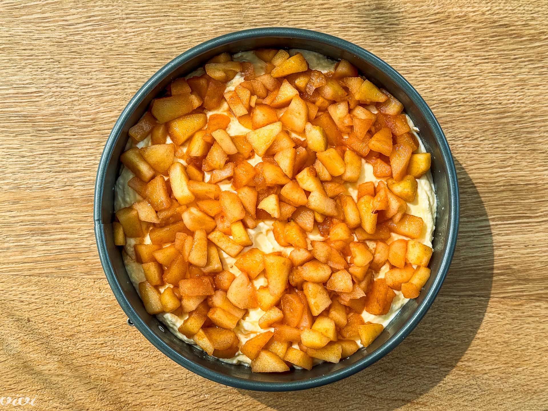 Pečico segrejemo na 175 stopinj. Jajci, sladkor, vanilijev sladkor in ščepec soli stepamo v mešalniku 8 minut. V jajčno kremo zamešamo skuto, sveži sir in pomarančno lupino. Na testo v modelu porazdelimo skutno maso, nanjo odcejena jabolka in po vrhu potresemo s preostalimi drobtinami.