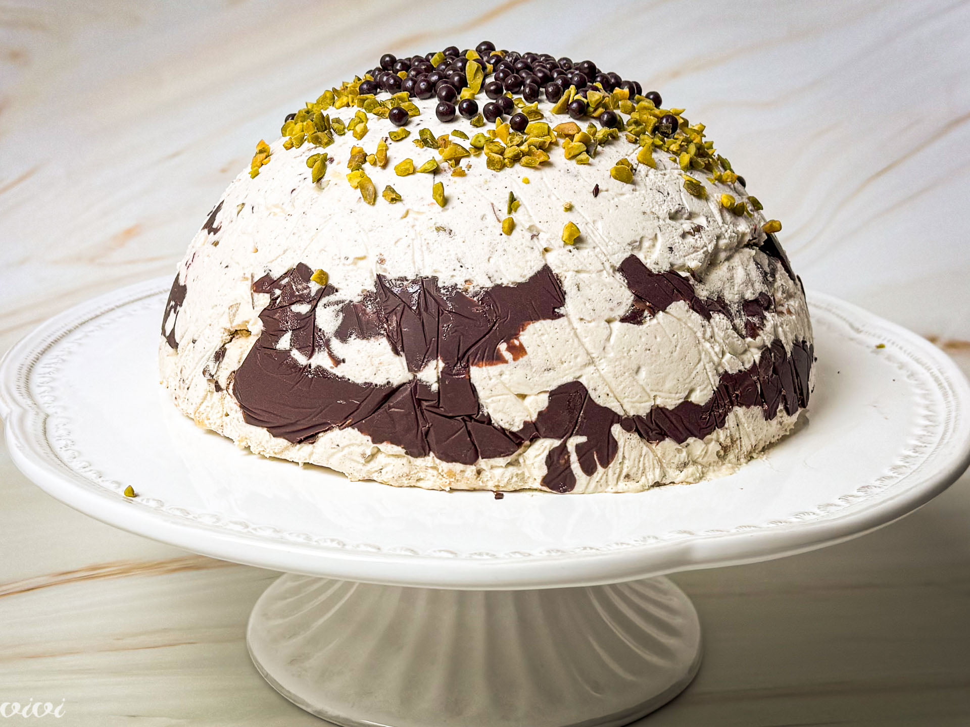 Čokolado sesekljamo in v majhnem lončku raztopimo nad soparo. Polokrogli model iz nerjavečega jekla (premer 22 cm, ca. 2 l) obložimo s prozorno folijo. Vanjo najprej porazdelimo maso z oreščki in jo premažemo s stopljeno čokolado.