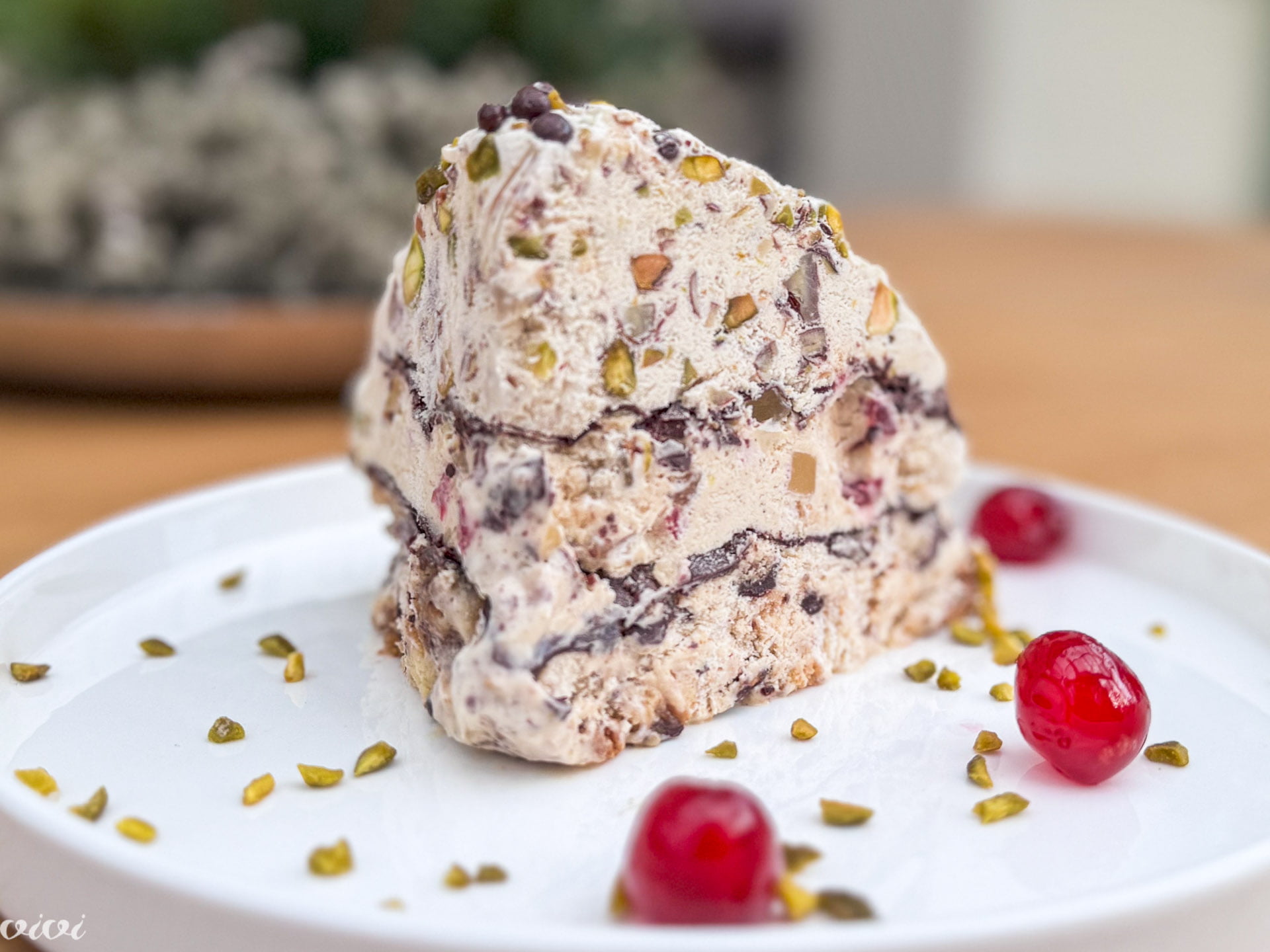 Piškote grobo nadrobimo in jih zmešamo s preostalim rumom. Kandirano sadje narežemo na majhne kocke. Pistacije in orehe sesekljamo. Maso za parfait razdelimo na tri dele. V enega zamešamo piškote, v drugega kandirano sadje in v tretjega oreščke.