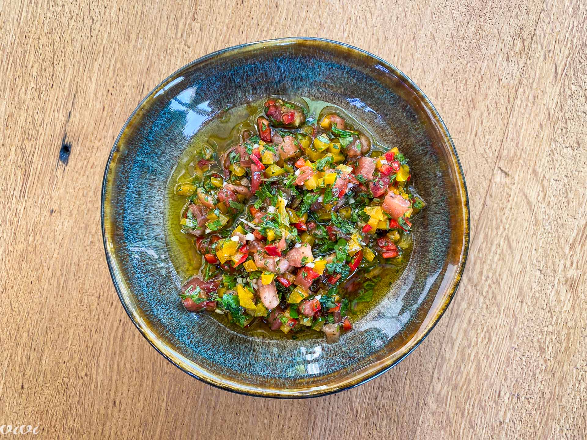 V skodeli zmešamo narezano zelenjavo, peteršilj in origano, čili, balzamični kis, olje, sol in sveže mleti poper. Do serviranja chimichurri postavimo v hladilnik.