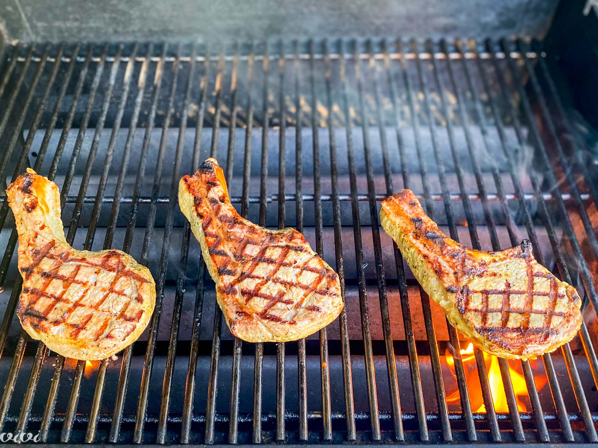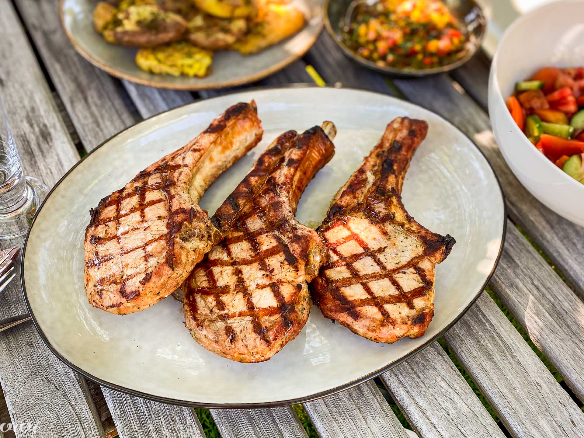 Tomahavke opečemo na obeh straneh na vročem žaru in jih pečemo na srednji vročini še 3 minute na vsaki strani. Serviramo jih s pečenim potlačenim krompirjem, zelenjavnim chmichurrijem in paradižnikovo solato s kumaro.