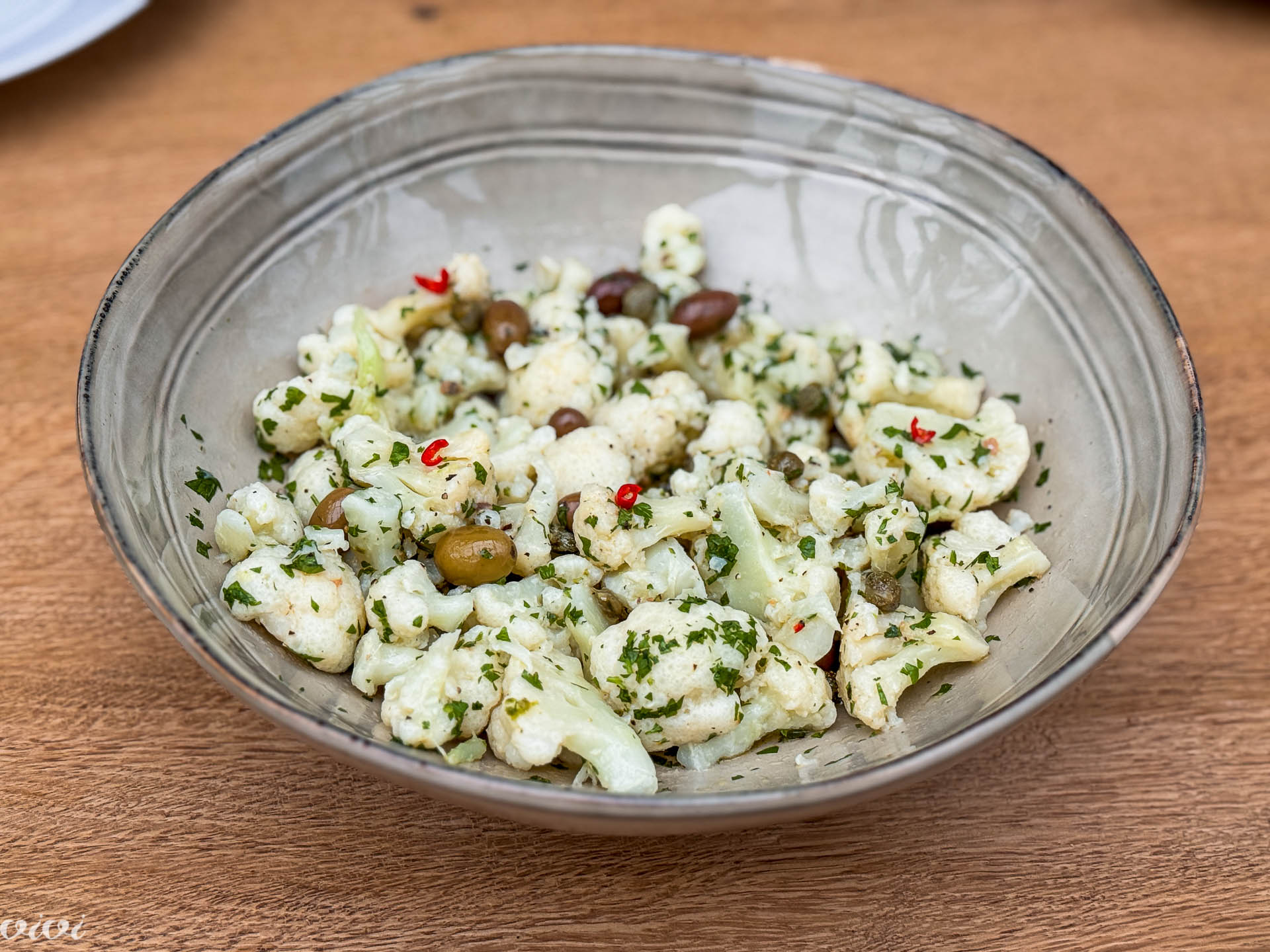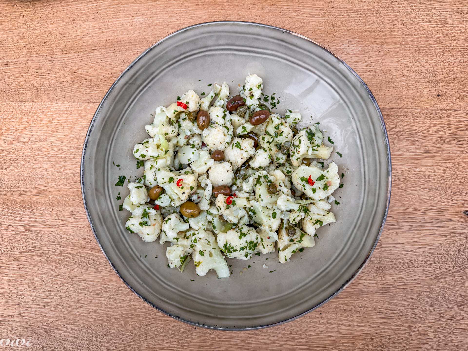Kuhano cvetačo odcedimo in stresemo v skledo s prelivom. Dodamo olive, kapre, čili in peteršilj, krepko začinimo s sveže mletim poprom in premešamo. Postrežemo še toplo kot prilogo k ribi ali samostojno z opečenimi rezinami kruha.