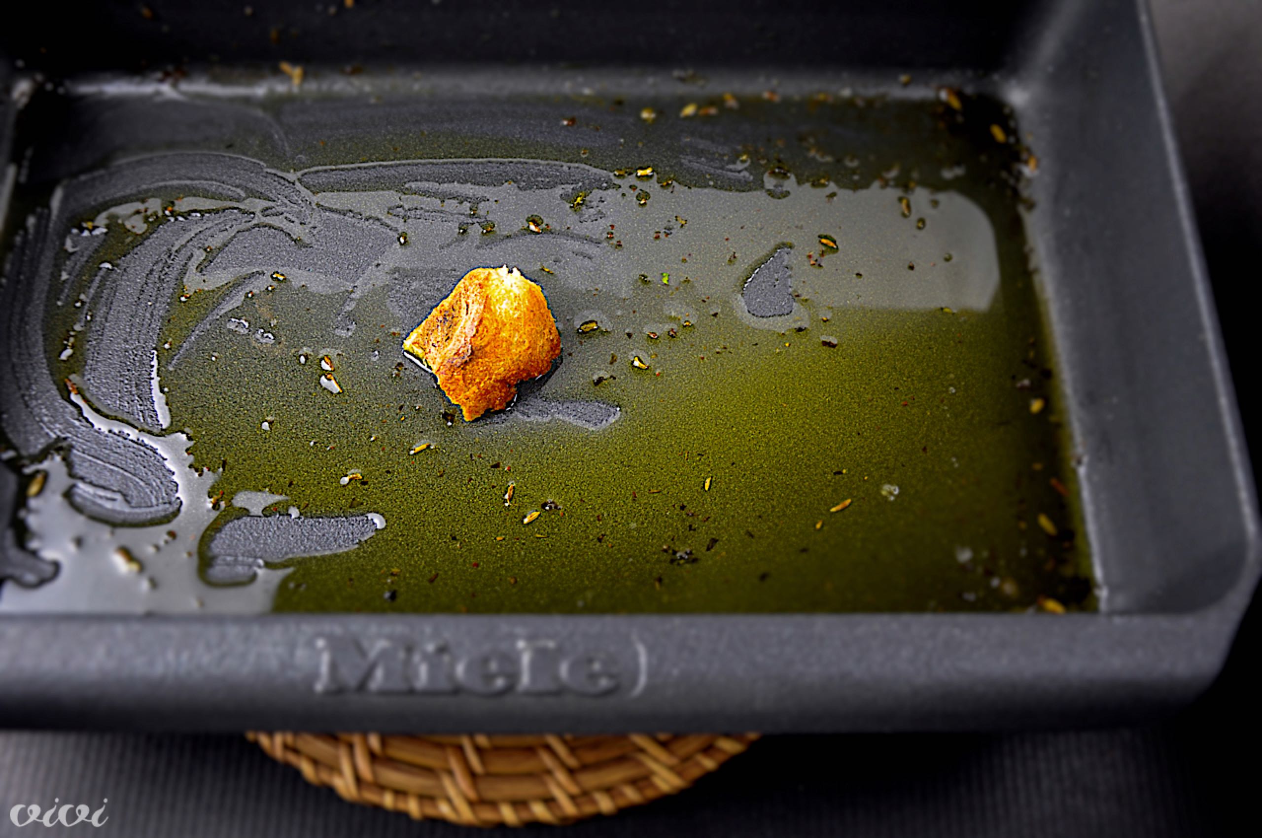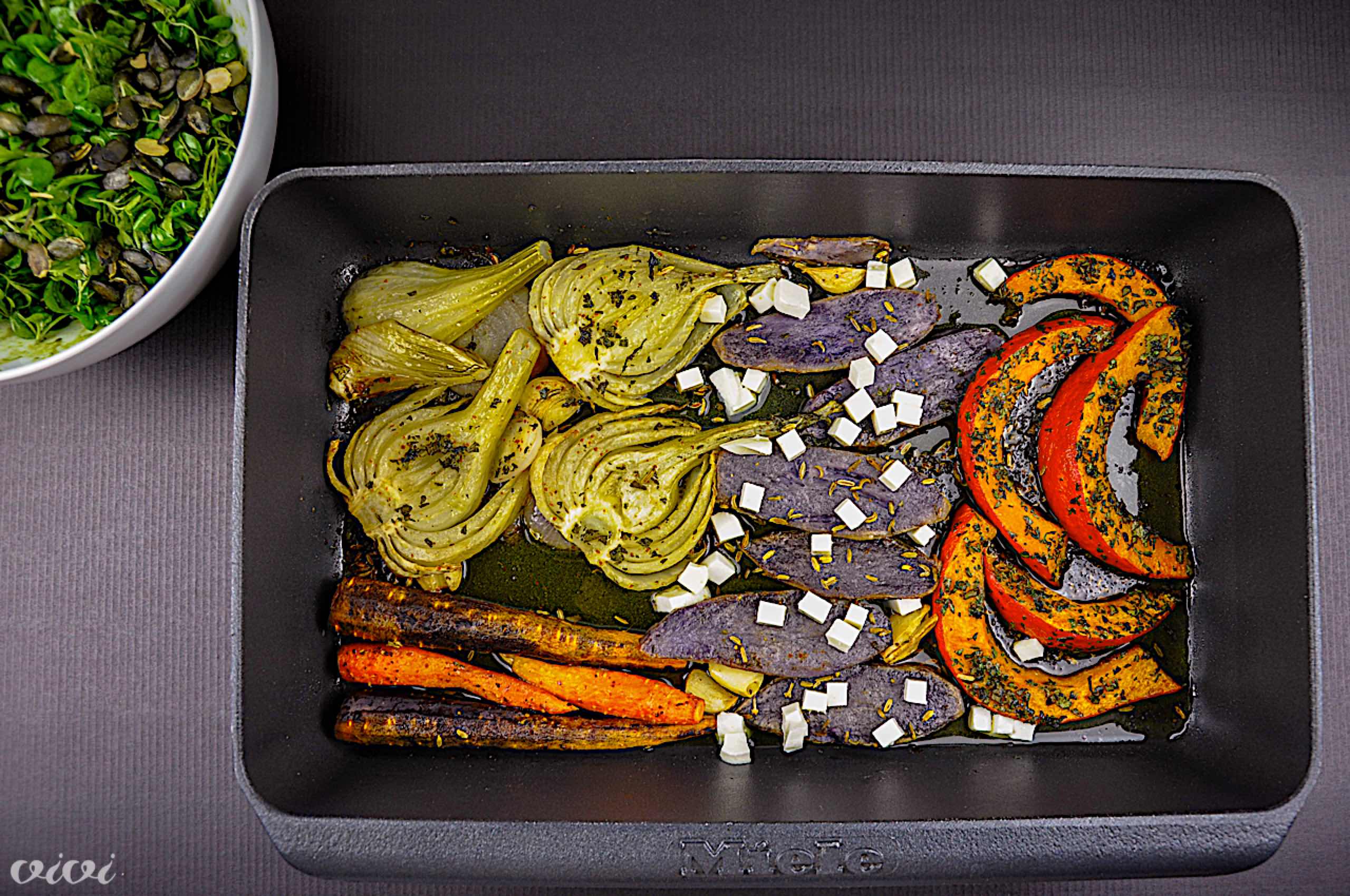 Odlične sestavine potrebujejo preprost recept. Zato tukaj ni drugega vmes kot dober (litoželezni) pekač in vroča pečica. Vse drugo opravijo najboljše deviško olivno olje iz slovenske Istre, najboljši česen, ki visi v shrambi še z dopusta v hrvaški Istri, buča, čebula, korenje, koromač z jutranje tržnice, vijolični krompir z eko Repovževe kmetije na Dolenjskem in solni cvet iz Seče. Le na ta način je takšno kosilo dobesedna šola okusov, saj je le takšno korenje res korenjasto, le takšna buča res bučasta, le takšen vijolični krompir res vijoličast …, ker ima le takšna zelenjava svoj lasten (nad)okus, vse skupaj pa zapeljivo karamelnost, ki kosilo pravzaprav postavi na glavo. Najprej je sladko, na koncu pa še slano. Oziroma, namesto sladice je za desert tisti kos ržene žemlje od zjutraj, ki popivna vse zelenjavne sokove, olje in koromačeva semena, vse tisto najboljše, kar je ostalo na dnu praznega pekača....