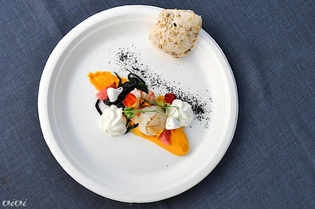 Kapesanta s črnimi nudli na korenčkovi kremi z marinirano kraljevo kozico, okisano redkvijo, ingverjevo peno, riževim čipsom in pesinim beljakom