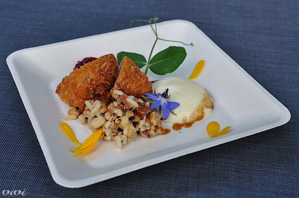 Ocvrt telečji priželjc na krompirjevi peni, miks žitaric in ribezov chutney