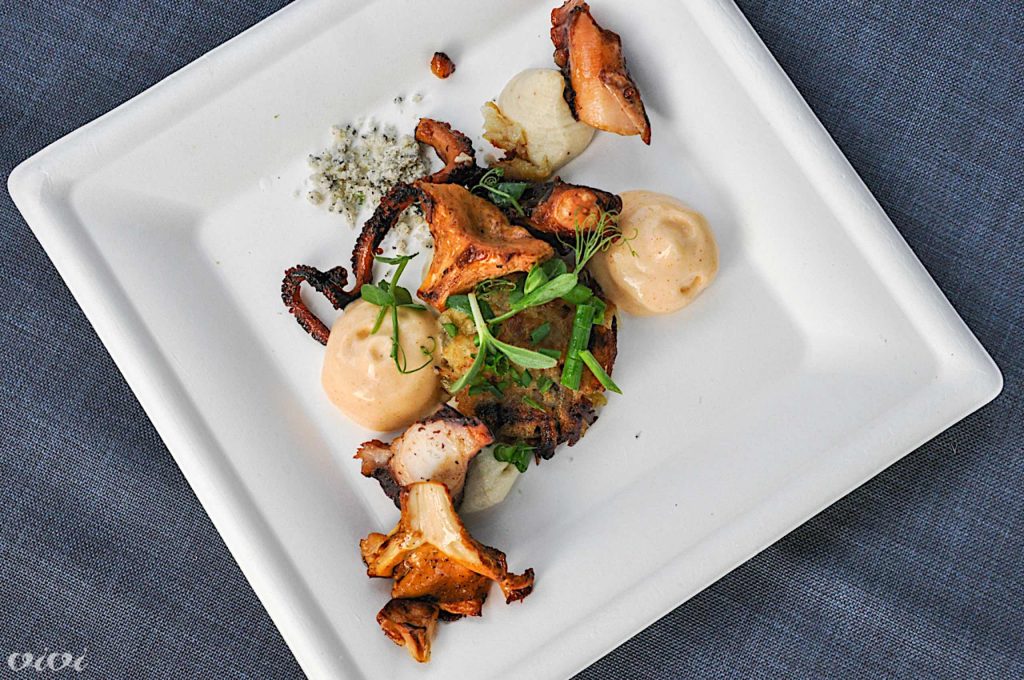 Jadranska hobotnica, krompir, ghee, kostni mozeg, pohorske lisičke, drobnjak, jastog v sifonu
