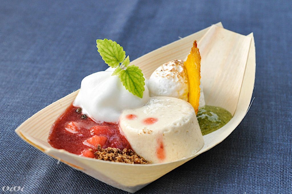Bezeg, jagode, pečena smetana, bela čokolada, črna kava