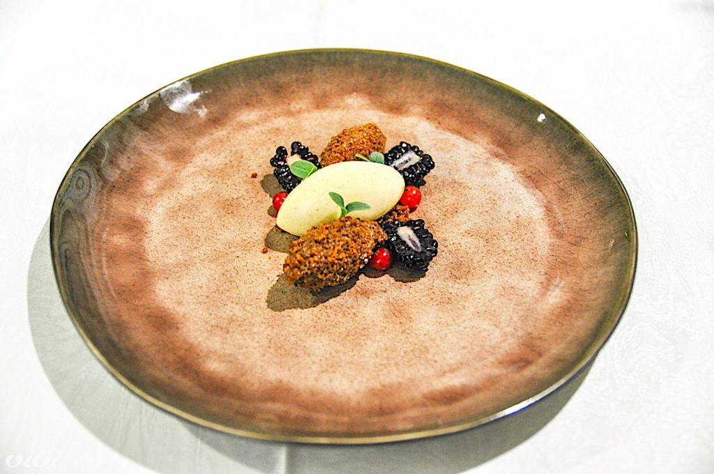 A jed, ki bo ostala najdlje v spominu, saj je bila najbolj dovršena in najbolj chefovska, je bila ”le” predsladica. Sladoled je bil polnjen s čebulo (žele), skuta je bila oblečena v ržene drobtine, oboje je povezal okus bučnega olja, vse skupaj pa zaokrožila sadna svežina ribeza in robid. Bravo!