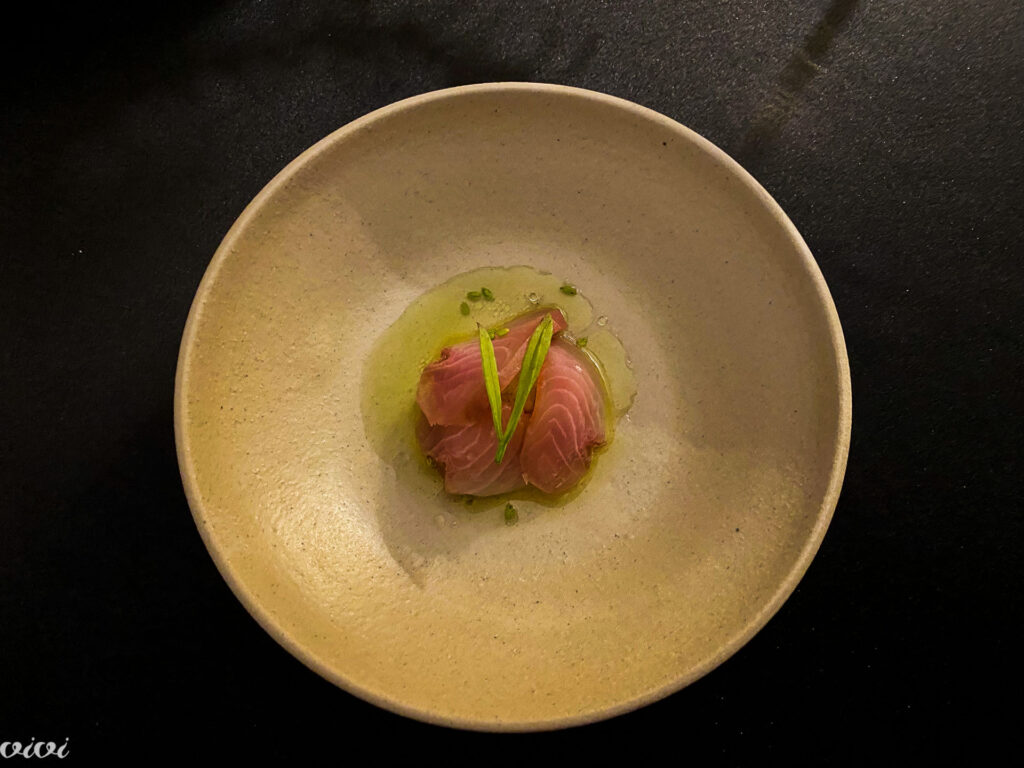 Grič: suho zorjeni gof, spodaj zelene jagode, olje iz ječmenovega luchuensisa in črnega ribeza.