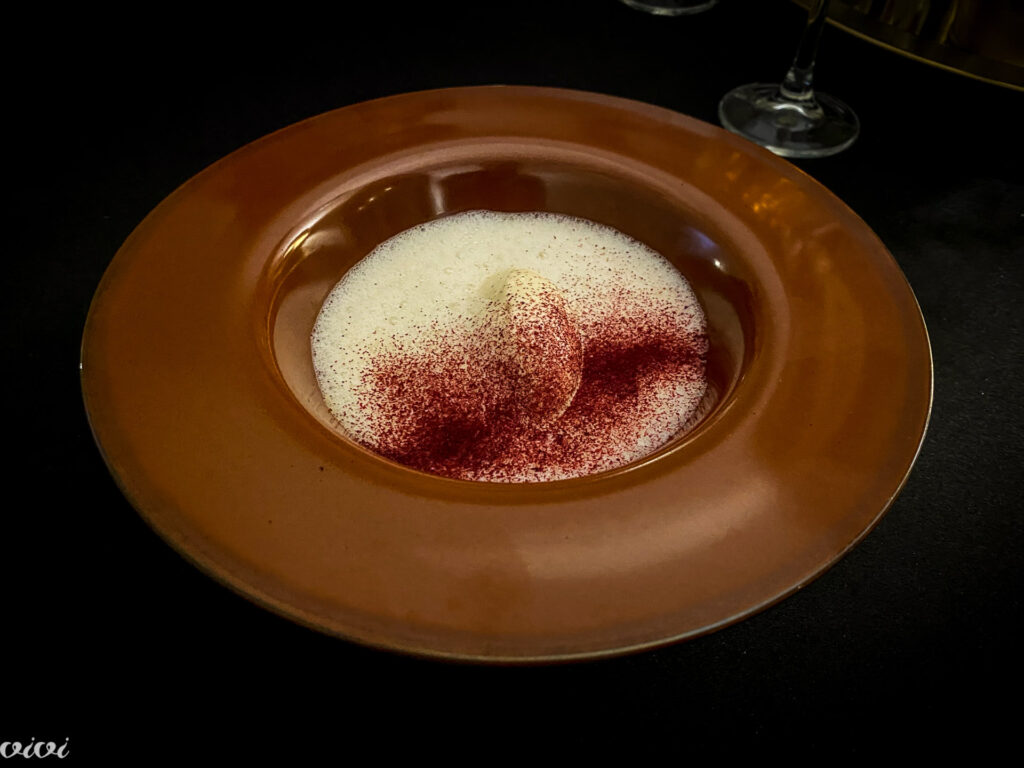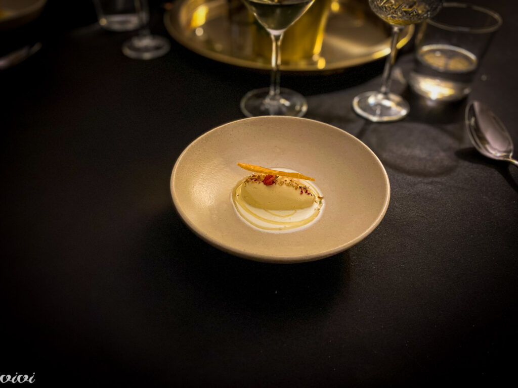 Milka: sladoled iz drožastega kruha, diplomat krema iz cikorije, krema iz čaja in rjavega masla, marmelada črnega ribeza, karamelizirana sončnična semena.
