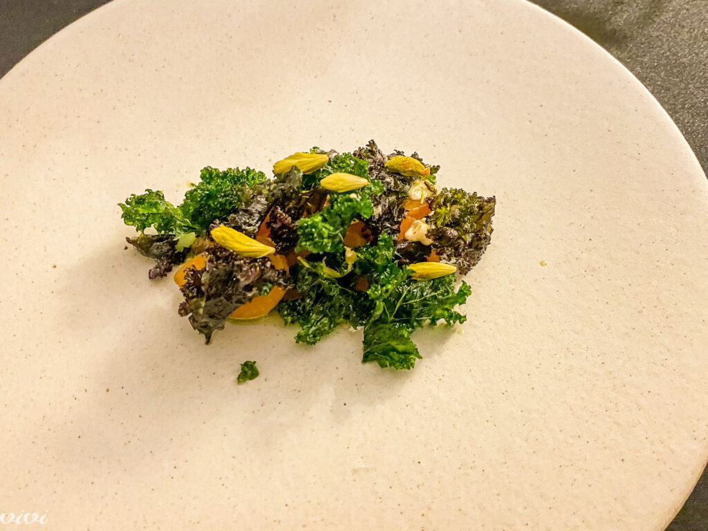 Milka: koleraba v kombinaciji z brinovimi vejami, krema prežgane smetane, ocvrti listi kolerabe, okisani gozdni vršički.