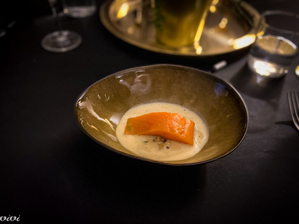 slano linško oko polnjeno s piščančjo pašteto, češminova marmelada, hrustljava piščančja koža (Milka);