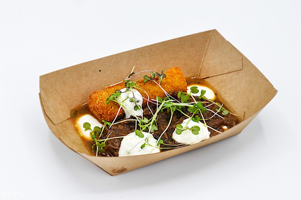 Goveji rep, počasi kuhan 32 ur, ocvrt krompir, narejen iz praženega krompirja, drobnjakovo olje, kisla smetana in gorčična kreša.