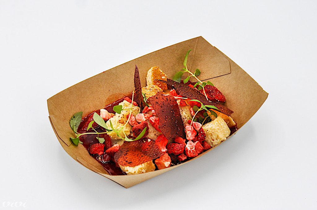 Jagodni džem z bezgovim sorbetom, čips jagod, liofilizirane (posušene z zmrzovanjem) jagode, sečuanski poper in kreša limonske bazilike.