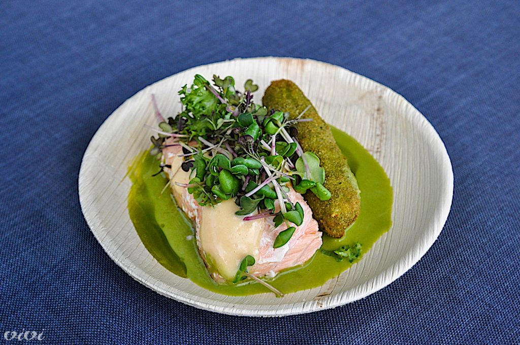 Poširan losos: losos konfitiran v olivnem olju, ocvrtek polnjen s sirom, skuto in koriandrom, ocvrt v zelenih drobtinah, čemaževa omaka, česnova majoneza in zelišča