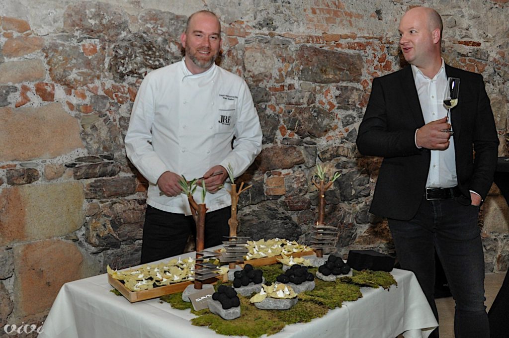 V črno-belem zbrane je posladkal, toda čisto drugače, z jurčki, brinovimi vejicami, smrekovimi vršički in črnim ribezom, grajski chef Marko Pavčnik iz laškega Pavusa. Ker je bil nato v stolpu še ”after”, so vsi skupaj napekli še dovolj filigransko oblikovanega drobnega peciva.